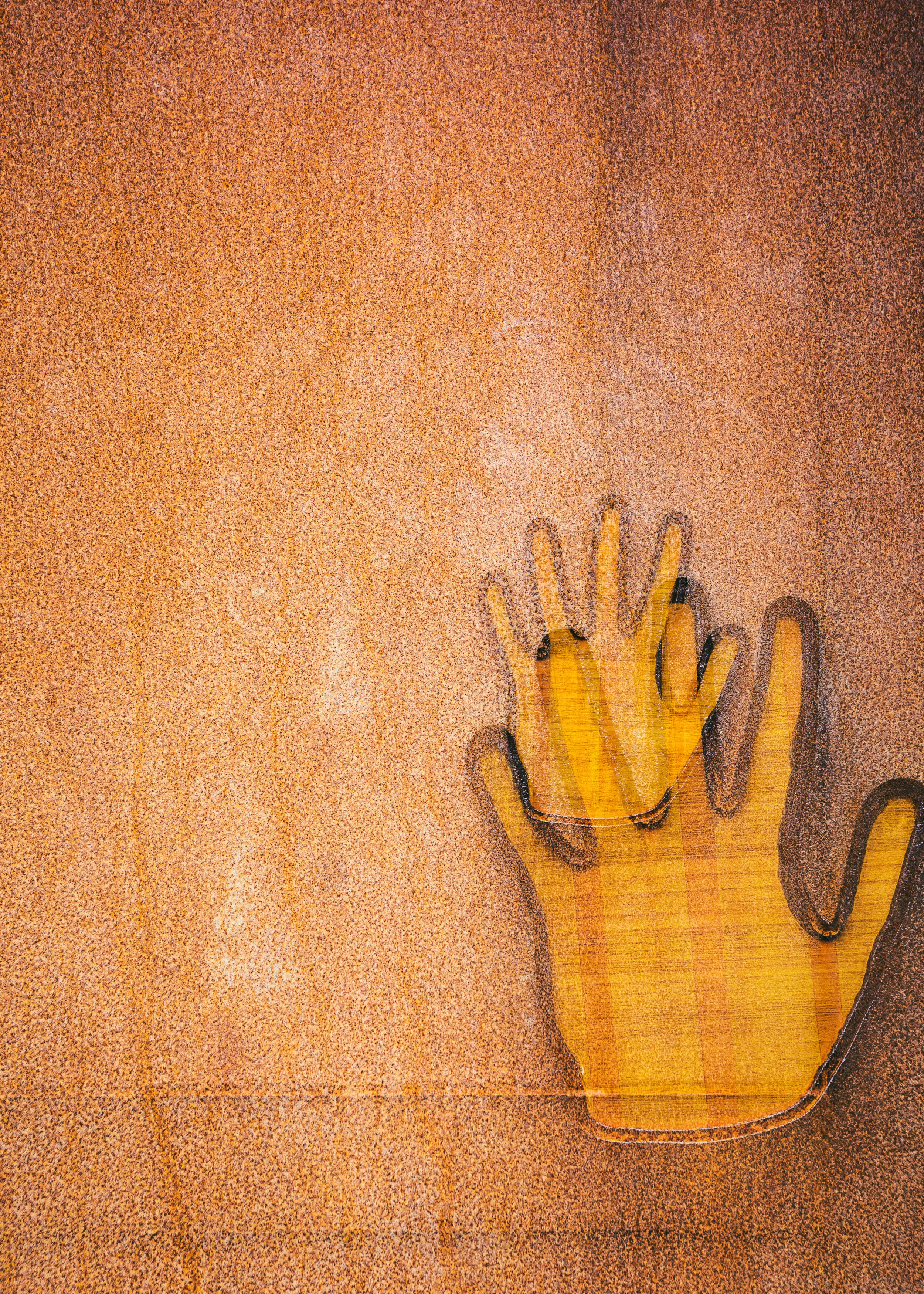 Corten steel door with a laminated timber hand shaped push plate on a new house in Fort George. Double exposure in Nik Collection Analog Efex Pro 2